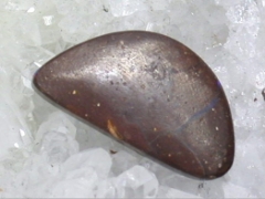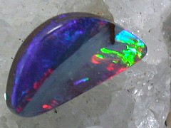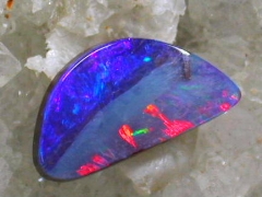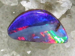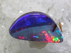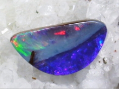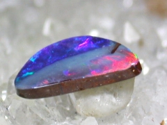 本当に自然に出来たオパールとしてはあまりにアートなオーストラリア、クイーンズランド産ボルダーオパールです。上の部分は濃いパープルブルーの遊色があり、下の部分は、赤を中心に、グリーン、スカイブルーなどのきれいな蛍光色のエレクトリックカラーが現われます。センター部分は色の濃いところにに鮮やかな赤の遊色が現われます。角度を変えるごとに次から次へと現われる遊色は圧巻です。 美しい地球の天然石STONE HIGH ボルダ^オパール。 |