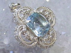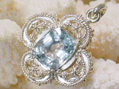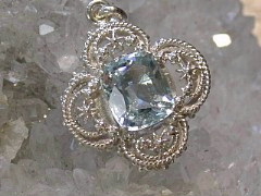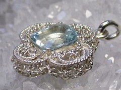 | 素晴らしい照りと透明感の涼しさあふれる美しいミャンマーアクアマリンです。勿論無処理です。清涼感のある気持ちの良い透明感で、インクルージョン非常に少なく、肉眼で気になるようなものはありません。柔らかくキラキラと輝くそうすは写真ではうまく表現できませんが、実物は写真よりいいと思います。ペンダントはミャンマー製ハンドメイドの細かい細工の大変凝ったもので、このペンダントを見るだけでも十分価値のある作りです。大きさがありますのでやトレーナーなどのうえからつけるのに最適です。ペンダントと石も非常に良くマッチしてお薦めの一品です。 | |