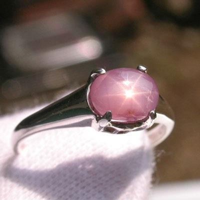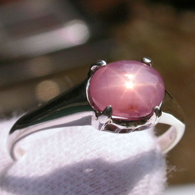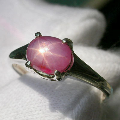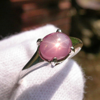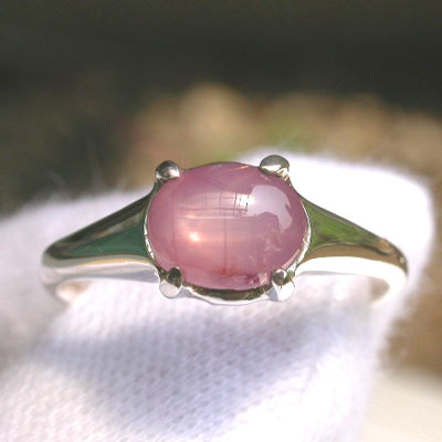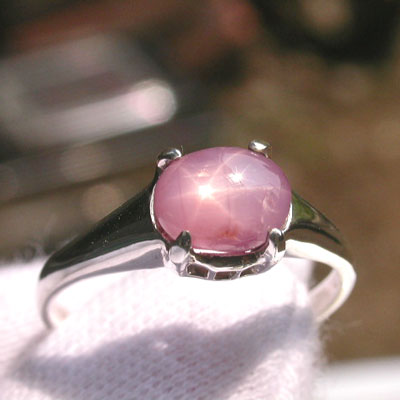 2.20ct:バランスの良いスターがハッキリとシャープに入るピンク色のスターサファイアです。写真で縦に線が入っているものがありますが、これはクラックではなく、シルクインクルージョンの影響で、ここの部分だけ、透明度が高く、鮮やかなピンクカラーになっています。同じものが平行にもう一本あります。正面からはあまり分かりませんが、サイドにも同じような模様があります。爪の辺りに帯状のインクルがあります。